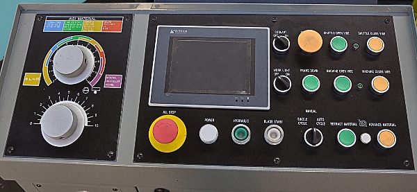 操作员的控制面板:方便地位于机器的左手边。它提供了对机器的所有功能的完全控制,如;锯床,锯架,夹束,触摸屏,穿梭机前进和后退,冷却剂,工作灯,等等