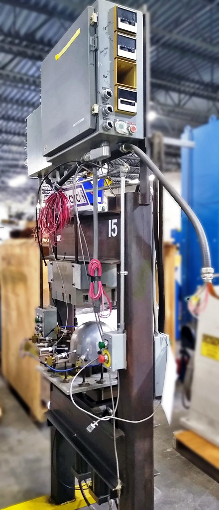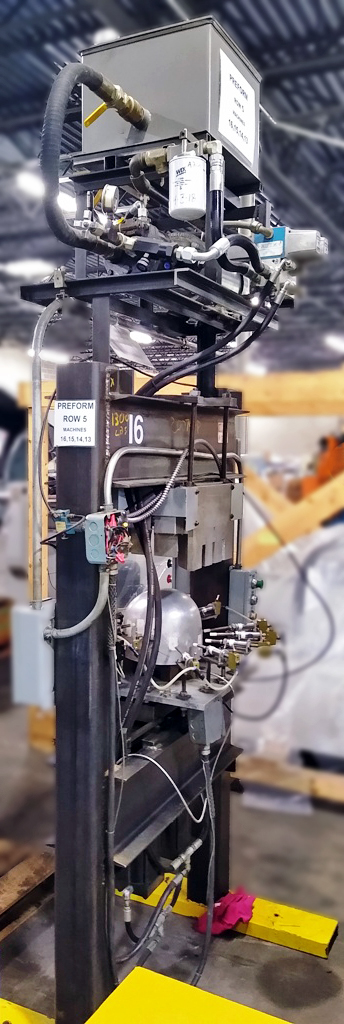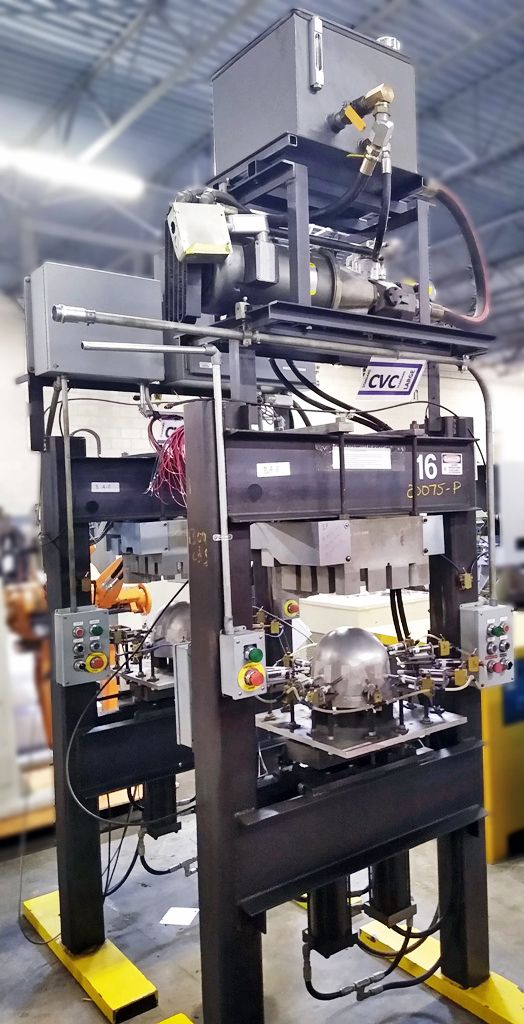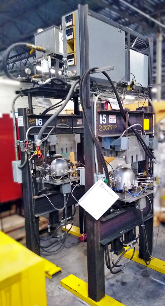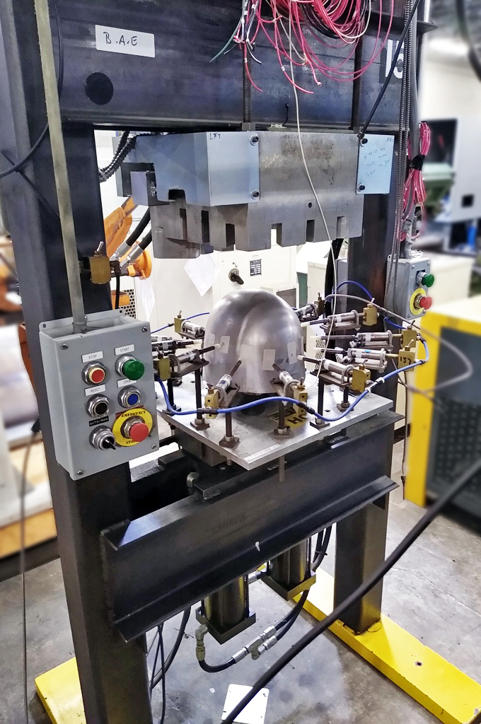 两种定制的H架,起动液压机。上次申请是在头盔制作中。用焊管钢构造。每个压力机都有一个固定的床,带有两个上升的液压缸。他们压入加热的模具